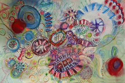 Lastly, I had to post a picture of my doodling. I had a lot of fun playing with the different mediums. I think it sort of looks like a county fair with the Ferris wheel on the right, a roller coaster, and the mass of bright colors.